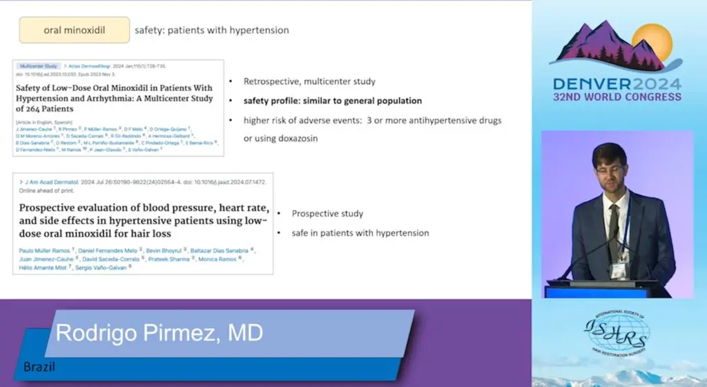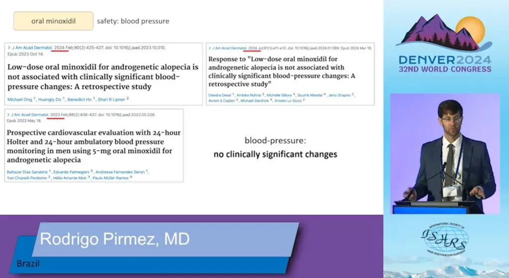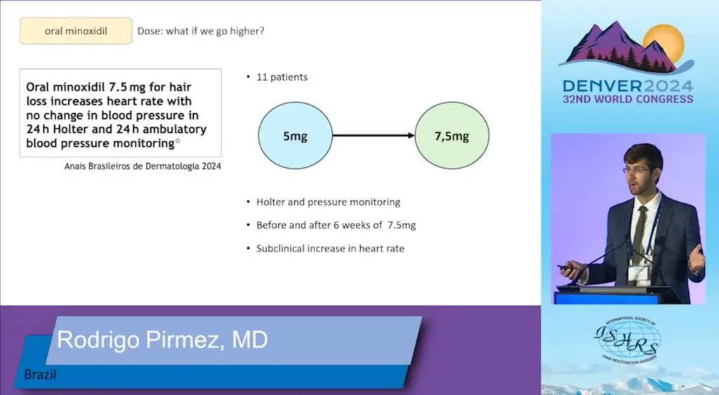 Ponadto, poruszony został temat stosowania dawek minoxidilu, które nawet przekraczają dawkę 5 mg na dobę. Dr Rodrigo Pirmez przedstawił badanie, niestety przeprowadzone tylko na 11 uczestnikach, w którym wykazano że u znacznej większości badanych pozytywny efekt terapeutyczny minoxidilu na włosy zwiększył się jeszcze bardziej. Przy czym nadal nie zauważono wpływu nawet tak wysokich dawek na ciśnienie tętnicze. U badanych stwierdzono jedynie bezobjawowy wzrost tętna.